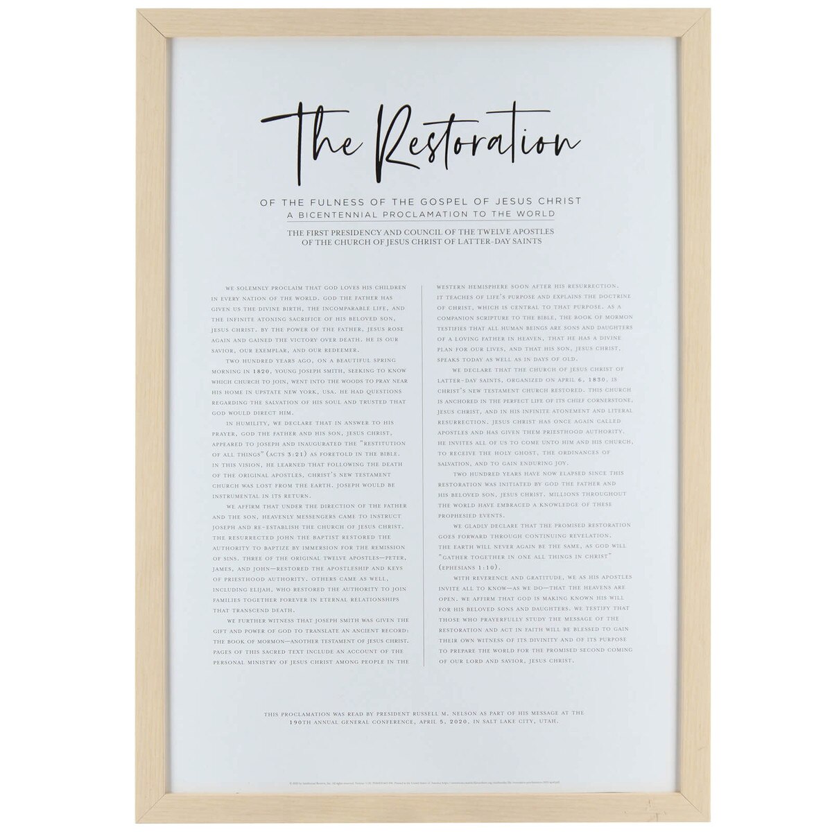 The Restoration: A Bicentennial Proclamation to the World - 14" x 21" Wall Art(0)No Reviews yet The Restoration: A Bicentennial Proclamation to the World - 14" x 21" Wall Art $100.00 Quantity discounts available QuantityPrice Gift Card Amount Quantity -+ Add to Cart Details Features: The Restoration of the Fulness of the Gospel of Jesus Christ: A Bicentennial Proclamation to the WorldArtist: Elise GomezArt Size: 14" x 21"... Details Back DetailsFeatures: The Restoration of the Fulness of the Gospel of Jesus Christ: A Bicentennial Proclamation to the WorldArtist: Elise GomezArt Size: 14" x 21" Frame Size: 15.5" x 22.5"See MoreSee Less Reviews 0 Back Ratings & ReviewsNo reviews availableBe the first to Write a Review