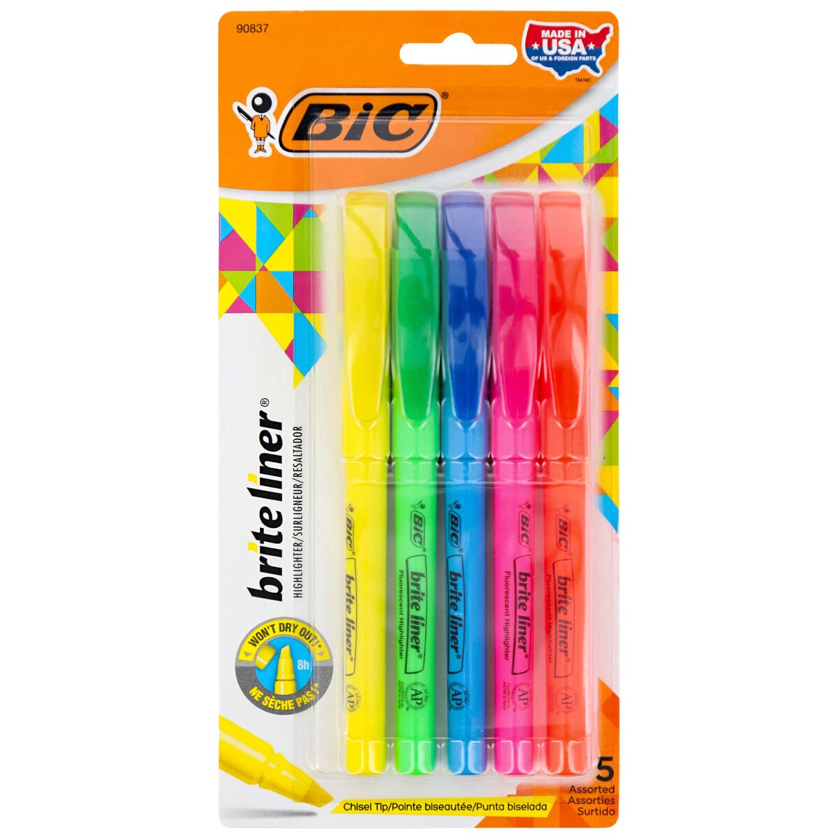 Color Brite Liner Highlighters - 5 Count(0)No Reviews yet Color Brite Liner Highlighters - 5 Count $3.59 Quantity discounts available QuantityPrice Gift Card Amount Quantity -+ Add to Cart Details 5 countColors: yellow, pink, blue, green, orangeChisel tipBright fluorescent inkContemporary lookWon't dry outBrand: Bic Details Back Details5 countColors: yellow, pink, blue, green, orangeChisel tipBright fluorescent inkContemporary lookWon't dry outBrand: BicSee MoreSee Less Reviews 0 Back Ratings & ReviewsNo reviews availableBe the first to Write a Review