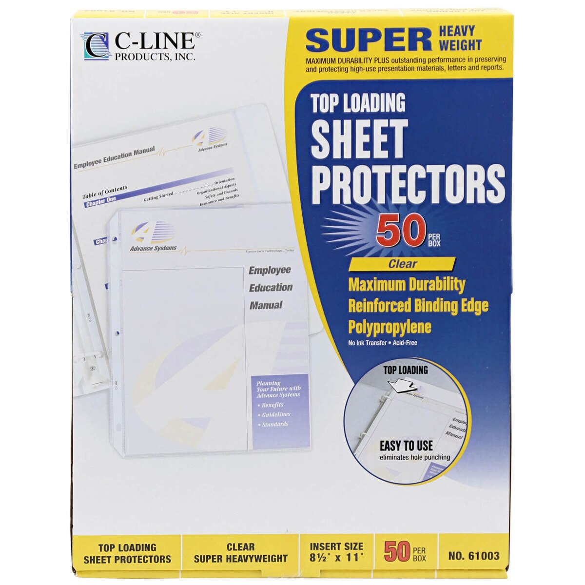 Top Loading Super Heavy Sheet Protectors - 50 Count(0)No Reviews yet Top Loading Super Heavy Sheet Protectors - 50 Count $19.99 Quantity discounts available QuantityPrice Gift Card Amount Quantity -+ Add to Cart Details 50 countSuper heavy weightClear3 hole punchedReinforced binding edgeNo ink transferAcid freeBrand: C-LineInsert size approx. 8.5" x 11" Details Back Details50 countSuper heavy weightClear3 hole punchedReinforced binding edgeNo ink transferAcid freeBrand: C-LineInsert size approx. 8.5" x 11"See MoreSee Less Reviews 0 Back Ratings & ReviewsNo reviews availableBe the first to Write a Review