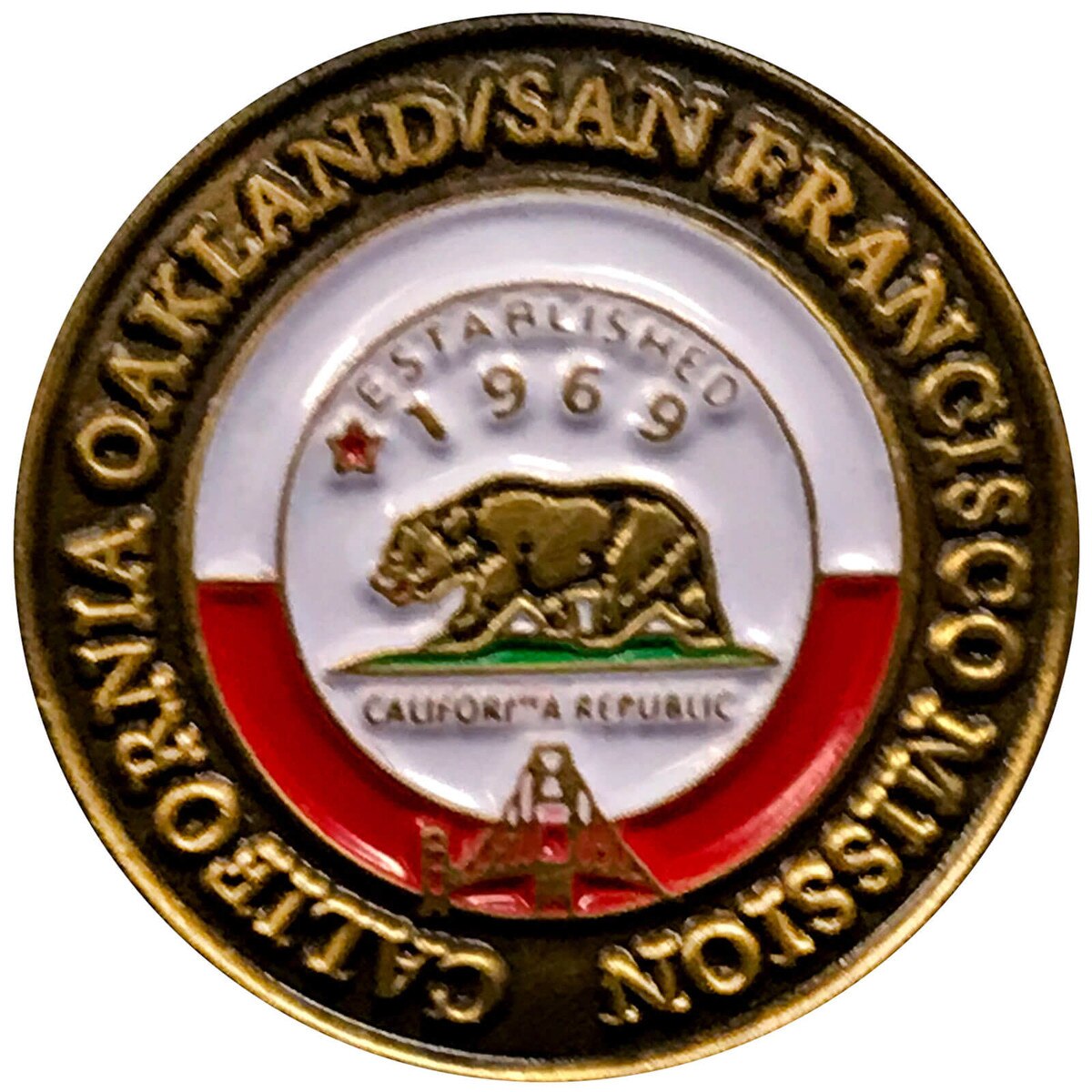 California Oakland/San Francisco Commemorative Mission Pin(0)No Reviews yet California Oakland/San Francisco Commemorative Mission Pin $12.99 Quantity discounts available QuantityPrice1 – 9$12.9910 – 24$11.0425 – 49$10.3950 +$9.74 Gift Card Amount Quantity -+ Add to Cart Details Est. 1969Solid metalGold-platedAntique rubbed finish7/8" diameterHand paintedButterfly pin backBrand: Bennett Brands Details Back DetailsEst. 1969Solid metalGold-platedAntique rubbed finish7/8" diameterHand paintedButterfly pin backBrand: Bennett BrandsSee MoreSee Less Reviews 0 Back Ratings & ReviewsNo reviews availableBe the first to Write a Review