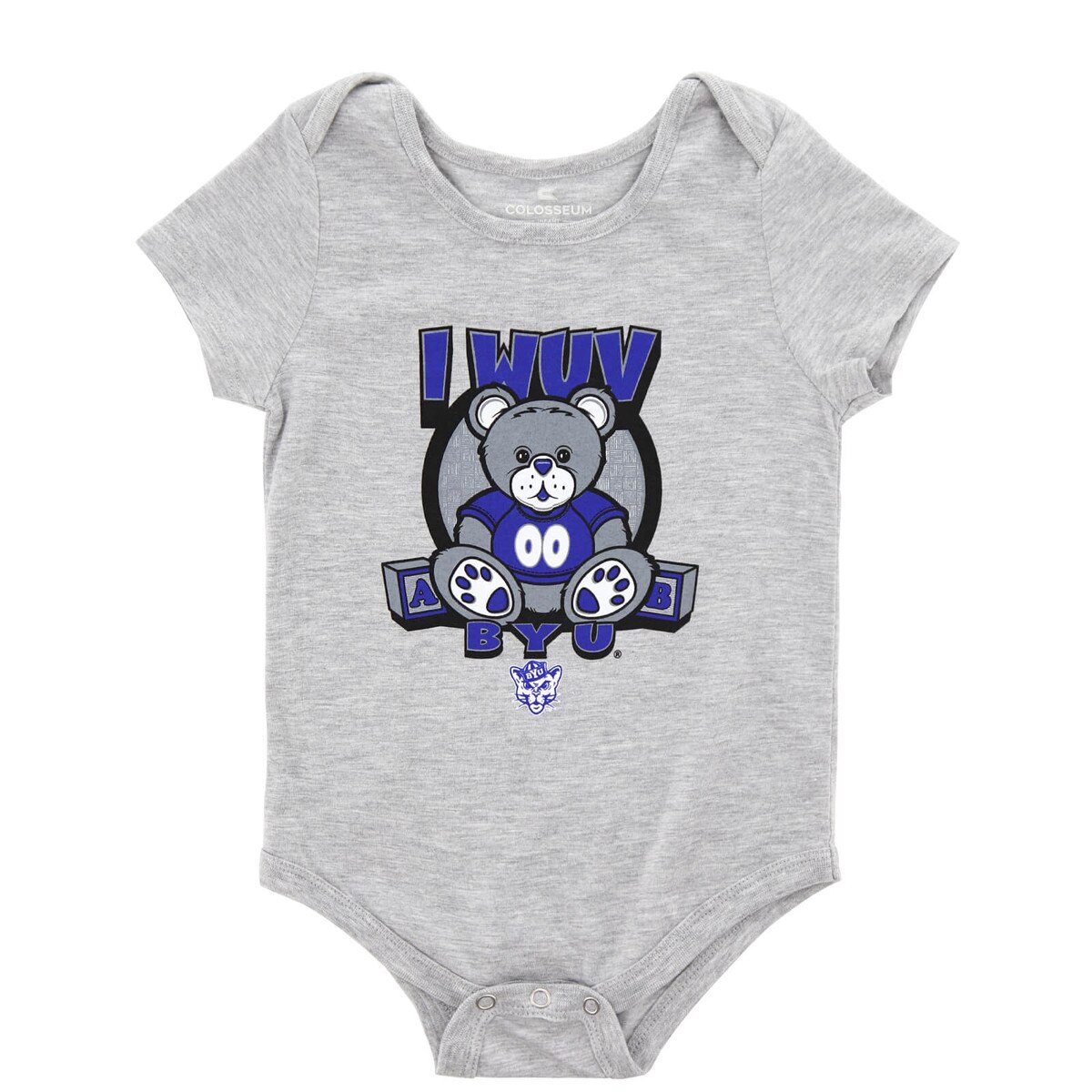 Dress your littlest fan in adorable BYU spirit! This Colosseum one-piece features charming "I Wuv BYU," teddy bear, and sailor hat cougar screen-printed logos, making it a strong choice for future Cougar loyalists. Made from a soft cotton-polyester blend with convenient inseam snaps, it's perfect for all-day comfort.