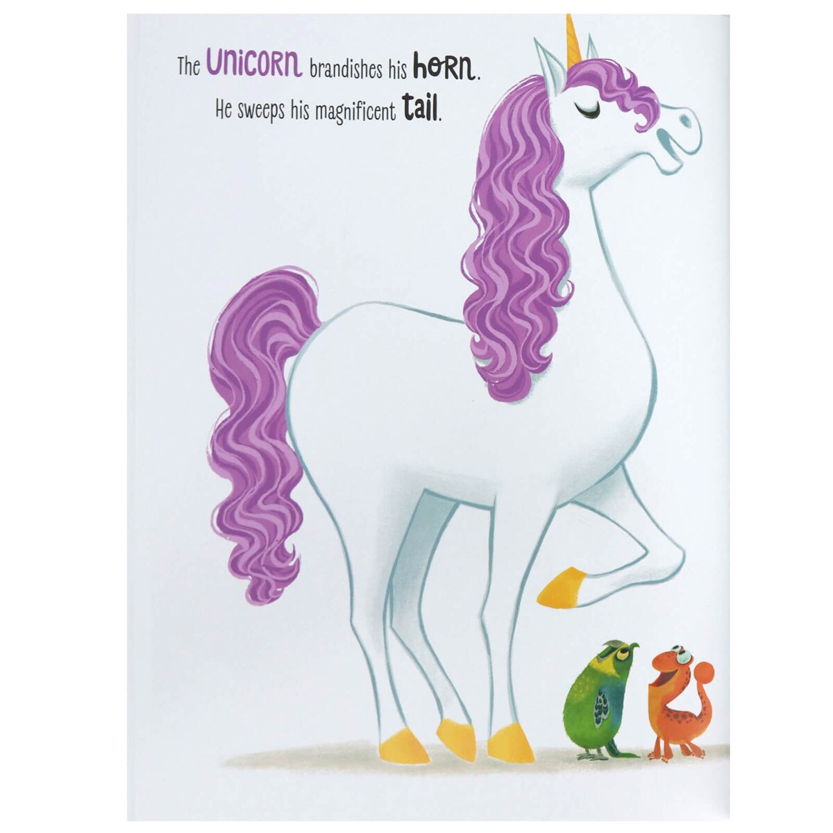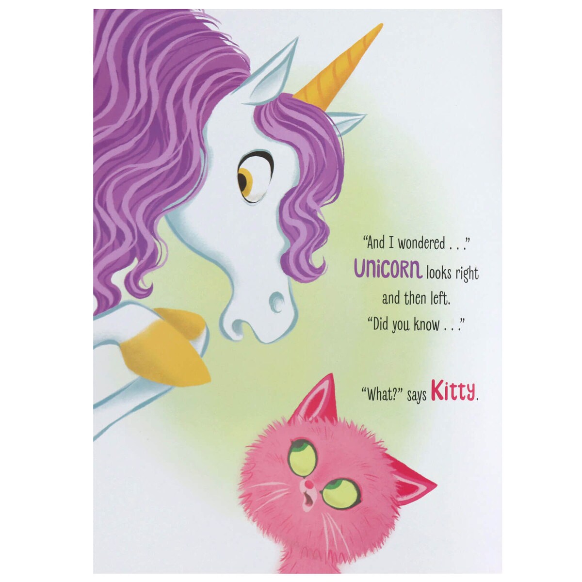 But when unicorn clops clops clops over, sweeping his magnificent tail and neighing a mighty neigh, Kitty feels no bigger than a ball of lint.