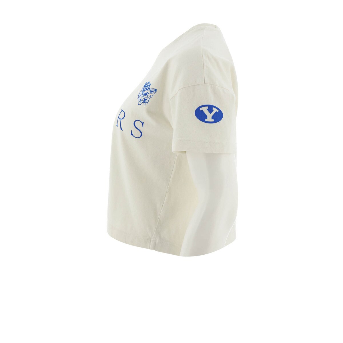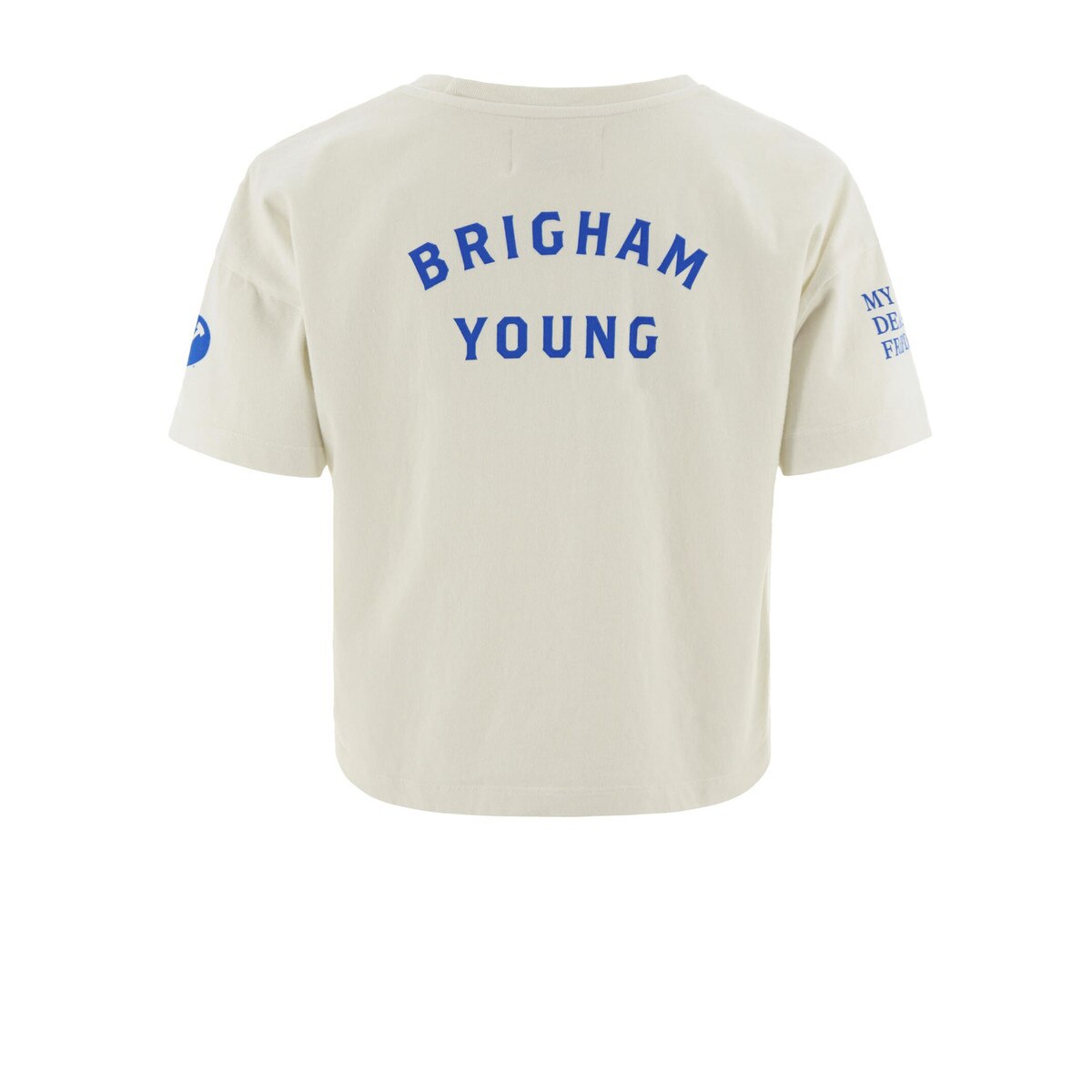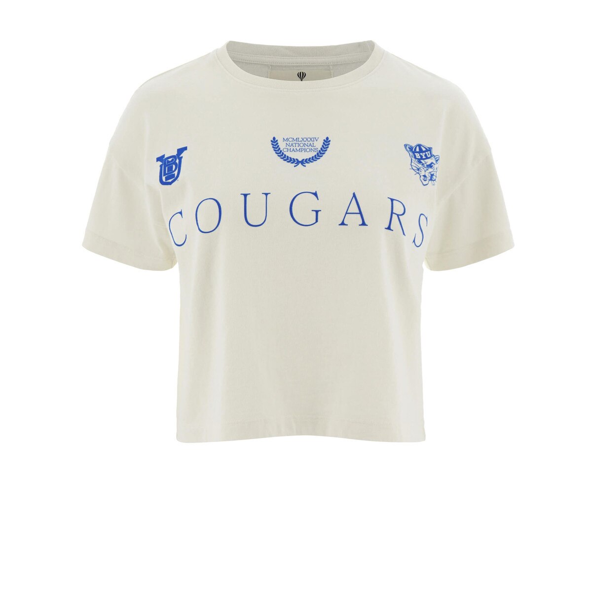 Celebrate Cougar history with this unique crop top from My Dearest Friends. It features a variety of iconic screen-printed BYU logos, including a nod to the 1984 National Champions. Crafted from soft 100% cotton, it's a fashionable and comfortable choice for any devoted fan.