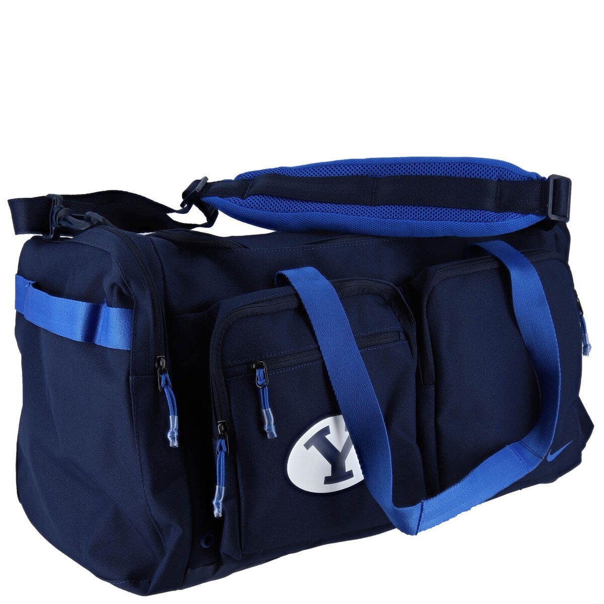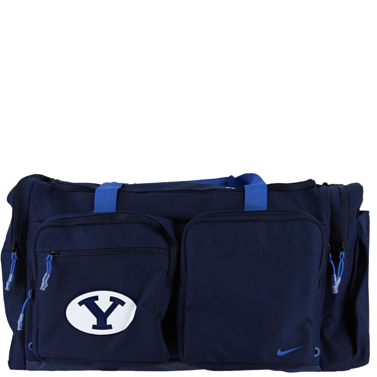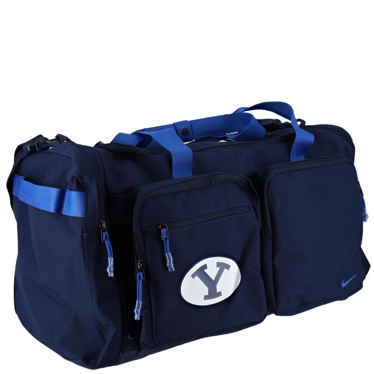 Gear up for your next adventure with this Nike BYU duffel bag. Featuring screen-printed Oval Y and Brigham Young logos, this spacious bag offers ample storage with a zippered main compartment and five exterior zippered pockets. The adjustable shoulder strap and three carrying handles provide versatile transport for all your essentials, making it ideal for travel or the gym.