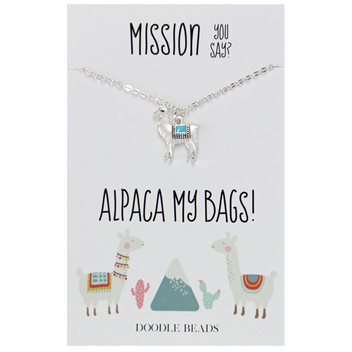 Mission You Say? Alpaca Necklace(0)No Reviews yet Mission You Say? Alpaca Necklace $12.99 Quantity discounts available QuantityPrice Gift Card Amount Quantity -+ Add to Cart Details Card: Mission you say? Alpaca my bags!Silver finishAlpaca charmLobster claspAdjustable chainBrand: Doodle Beads Details Back DetailsCard: Mission you say? Alpaca my bags!Silver finishAlpaca charmLobster claspAdjustable chainBrand: Doodle BeadsSee MoreSee Less Reviews 0 Back Ratings & ReviewsNo reviews availableBe the first to Write a Review